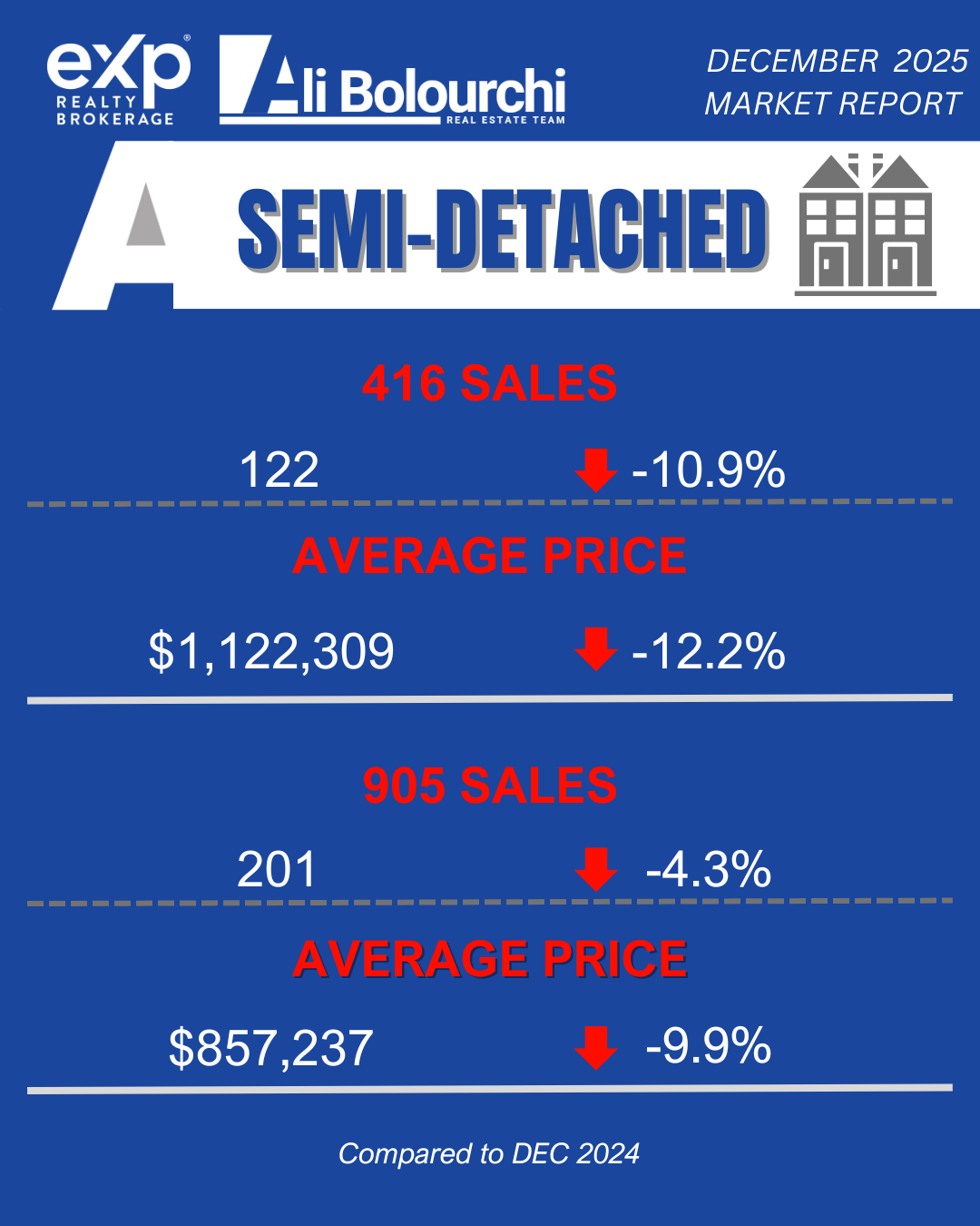 Semi-detached homes often serve as the bridge between condos and detached living. In December 2025, this segment experienced the most significant price adjustments, particularly in the 416.